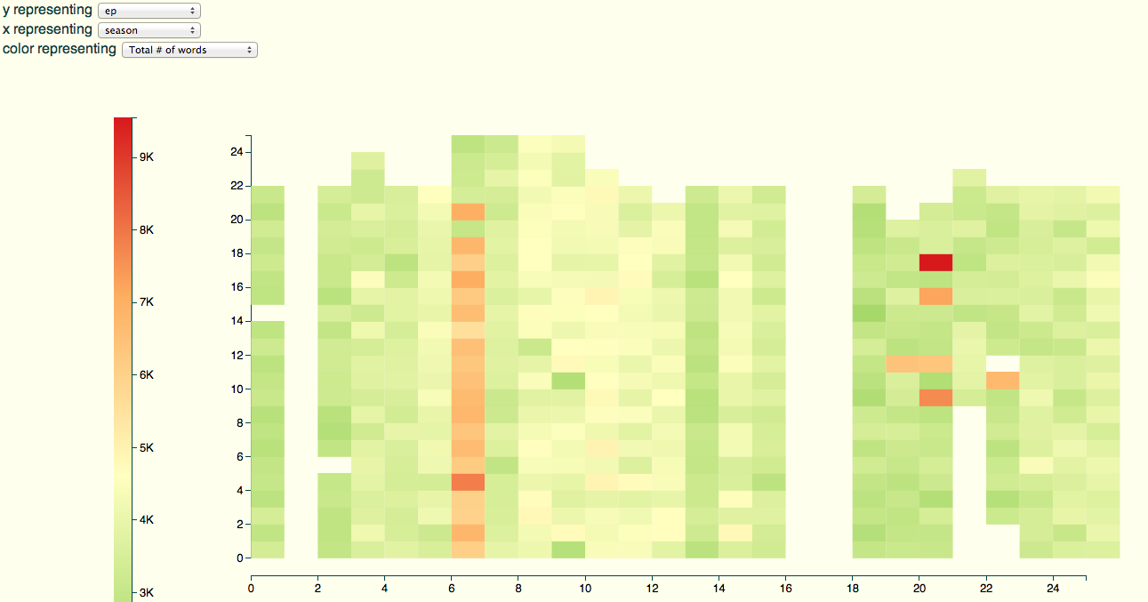 The first test is to find out about those pesky missing episodes. So I’ll plot a heatmap of the number of words for each episode (x axis) and season (y axis):