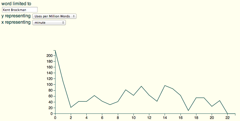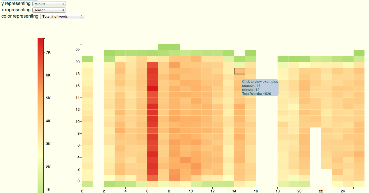 The beta lets us quickly check out some other things, like the number of words (color) by *minute* (y axis) and season (x): you can see commercial creep, as sometime around season 14 we lose most of minute 21.