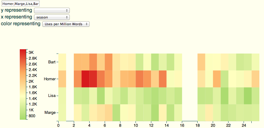 I thought it would be worth documenting the difficulty (or lack of) in building a Bookworm on a small corpus: I’ve been reading too much lately about the Simpsons thanks to the FX marathon, so figured I’d spend a couple hours making it possible to check for changing language in the longest running TV show of all time.