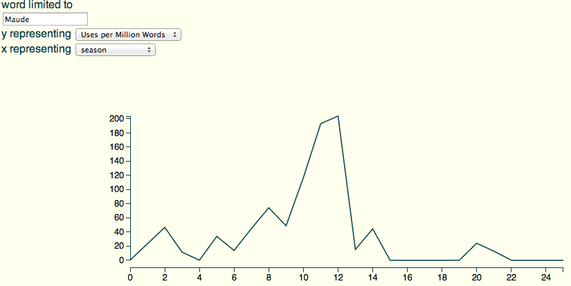 Just trying some line charts: yep, Maude only gets mentioned much by name around the season she dies: