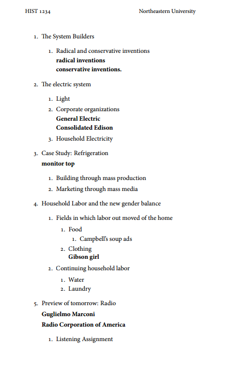 The slide decks are built with reveal.js, which drops everything into a nicely organized batch. Here’s what one looks like. (This is for a lecture on household technologies in the 20s). My favorite feature is that by hitting escape, you get an overall view of everything in the lecture sorted by header–this is particularly useful when studying for exams, because those headers align exactly with the outlines.