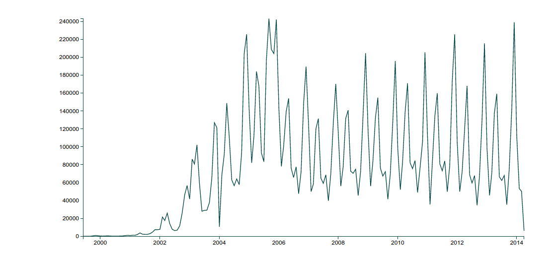7.People still use RateMyProfessor, though usage has dropped since its peak in 2005. Here’s a chart of reviews by month. (It’s intensely periodic around the end of the semester.