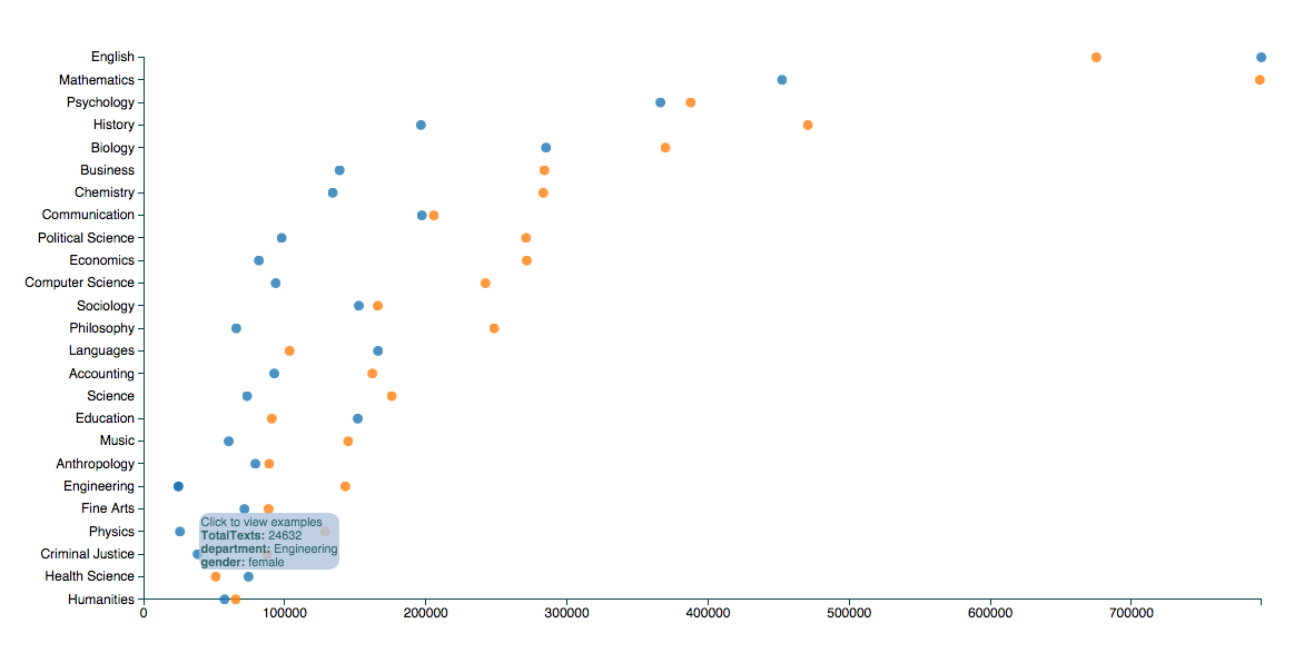 There are other ways of looking at the data other than this simple visualization: I’ve talked a little bit at conferences and elsewhere about, for example, using Dunning Log-Likelihood to pull out useful comparisons (for instance, here, of negative and positive words in history and comp. sci. reviews.) without needing to brainstorm terms.