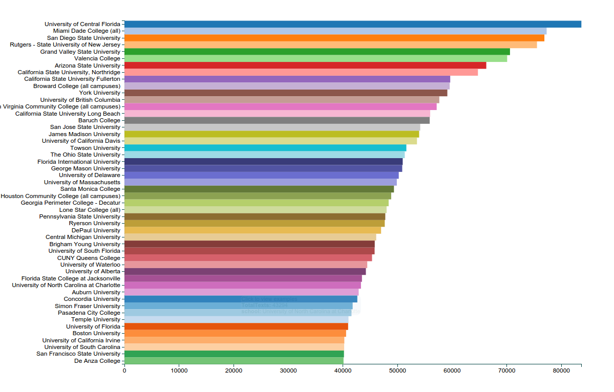 This includes many different types of schools, but is particularly heavy on masters and community colleges in the most represented schools. Here’s a bar chart of the top 50 or so institutions: