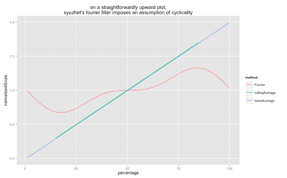 Even before Swafford posted her critique, I felt like there was something quite wrong about using the Fourier transform as a “smoothing” mechanism. Fourier transforms, in my experience with them, are bad at dealing with humanities data, because they rely on a very precise definition of “signal.” I’ve had to use wavelets instead of the Fourier transform in the past even to extract obviously periodic data from time series, because the assumptions of regularity in the fourier transform are so strong that some periods are simply missed.