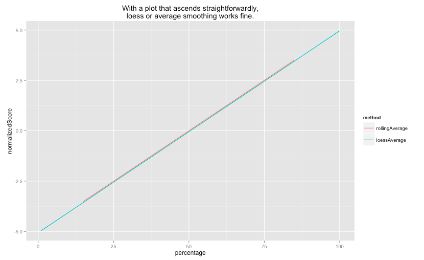 To put that graphically: this cyclicality means that syuzhet imposes an assumption that the start of plot lines up with the end of a plot. If you generate an artificial plot that starts with sentiment “-5” and ends with sentiment “5”, it looks like this with normal smoothing methods. (Rolling average or loess).