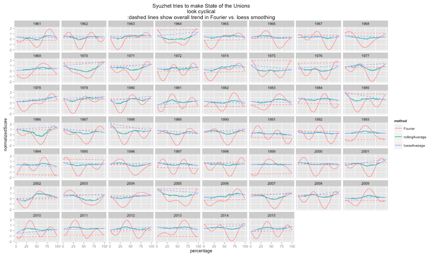 This holds true on real documents. I ran it on every state of the union address since 1960. I’ve added dashed lines to show the overall sentiment movement in the address. Blue shows loess smoothing from beginning to end, and red shows the fourier transform. As you can see, loess allows plots to get happier or sadder: fourier forces them to return almost to their starting place.