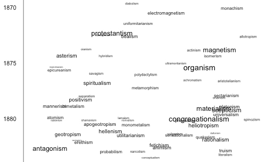 Ben, just now coming onto your site, great work–I’m struck by the persistence of religious denominations as the featured “isms” into the end of the 19C. They’re placed by the peak and the font size is by the number of hits at peak, you mention–is this in absolute terms, or is it weighted by number of publications per year? So this makes the graph heavy in the 20thC, no?