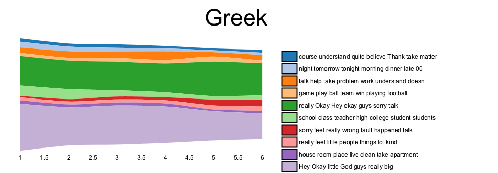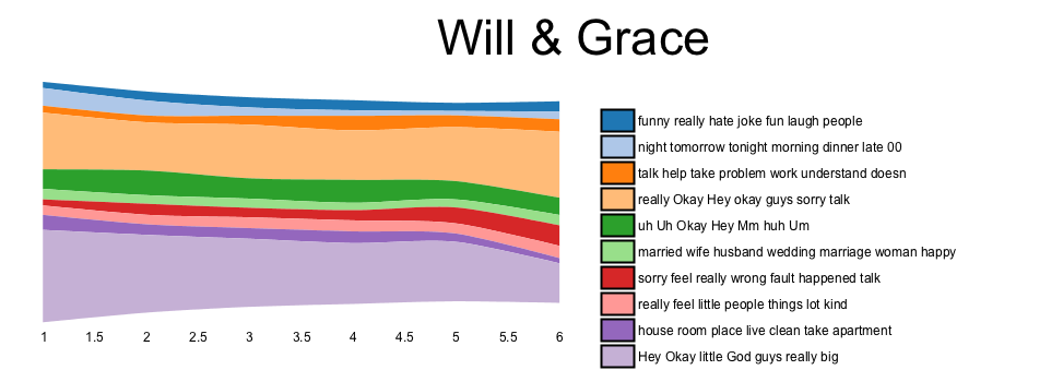 “Sex and the City” is similar, though less marked:the light green sex topic gets less significant through the course of the episode, though the smaller light orange “New York City” topic doesn’t change quite so much.